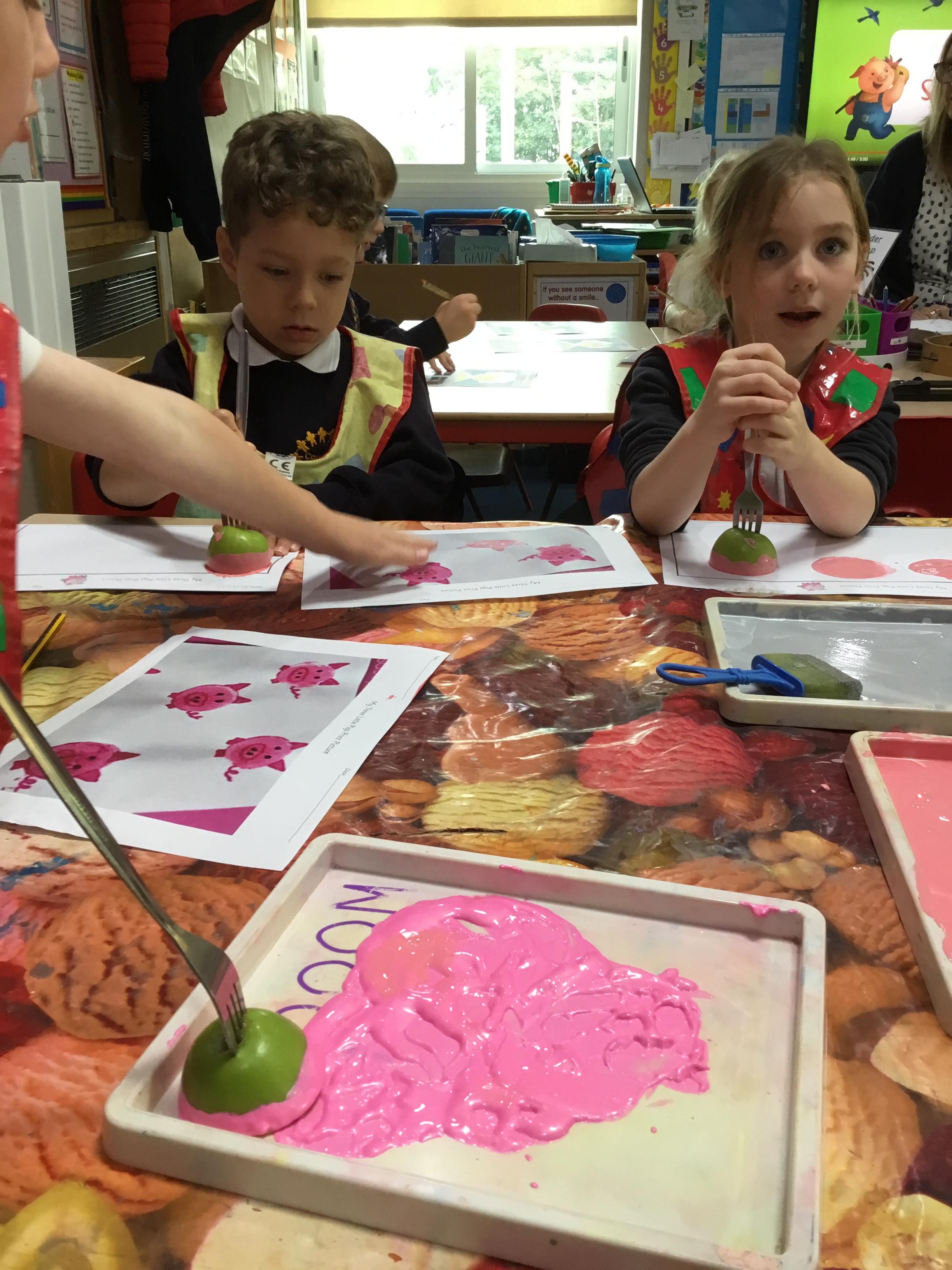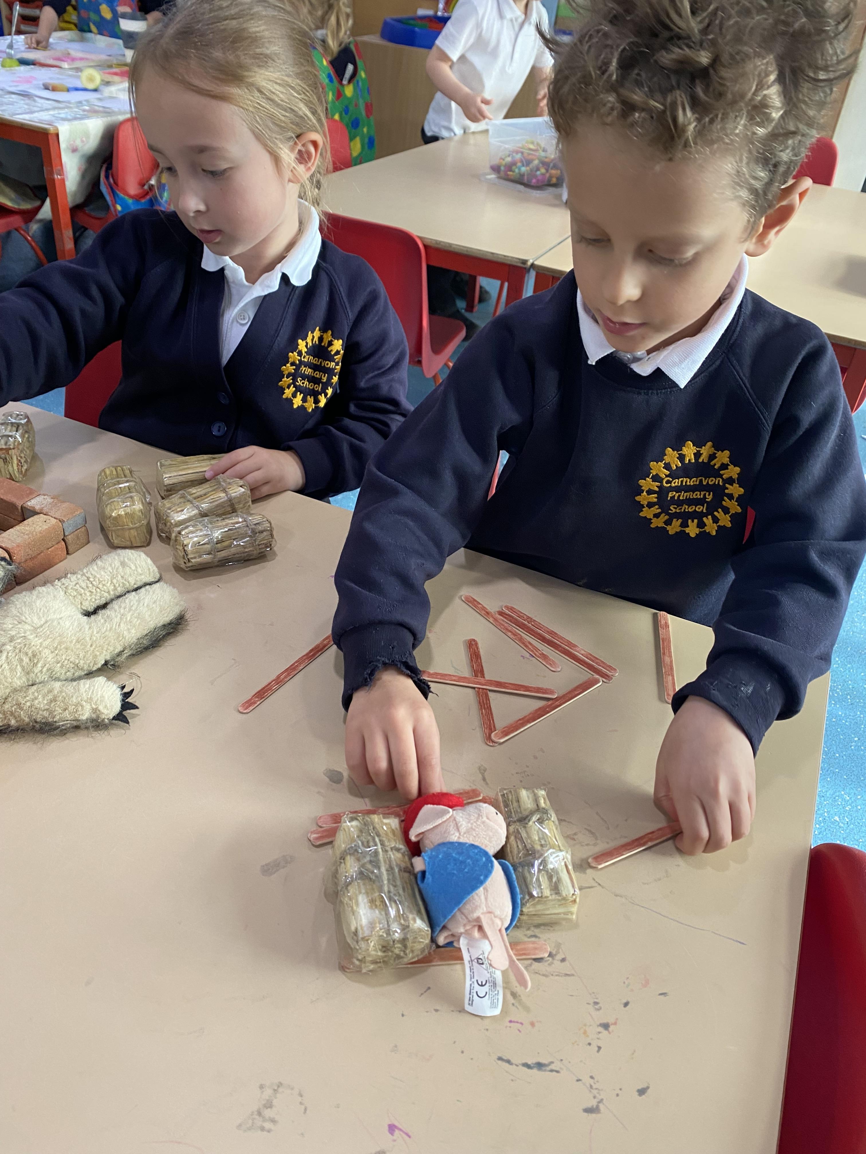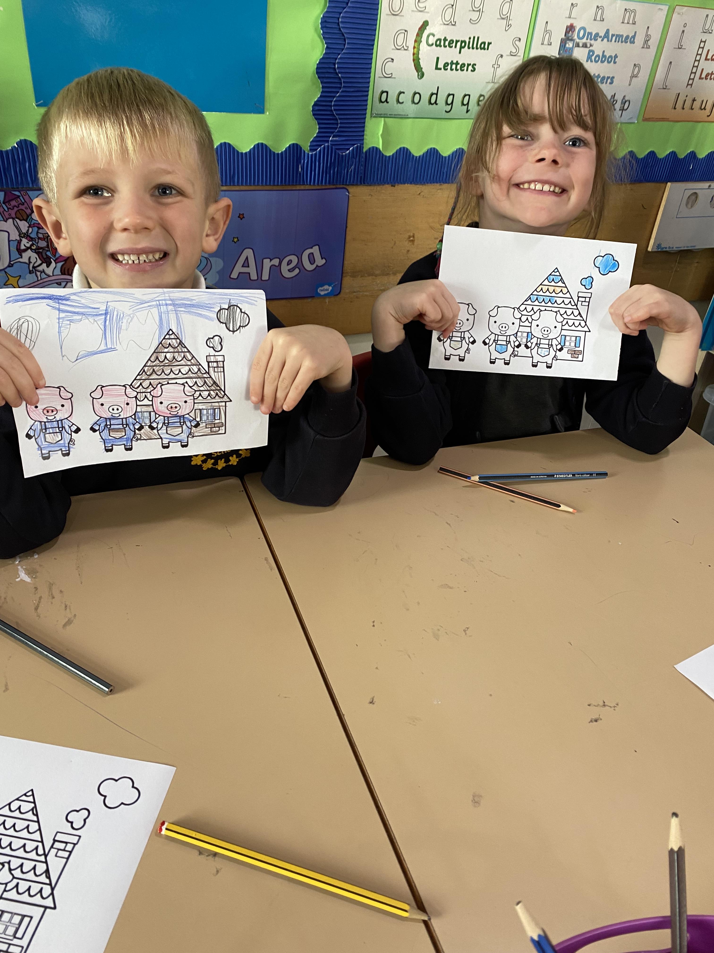 Year 1 have been doing activities based on the story The Three Little Pigs. We created pictures of the 3 pigs and the wolf using a printing method and then added the details afterwards using pens. Also, in science this week, we discussed the properties of a range of materials and then made bunting to test if our predictions were correct.