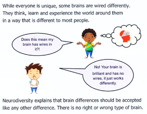 Neuro means brain, diversity means different. Every one of us has a different brain and thinks in a slightly different way. It is really important that we understand that everyone is different and those differences are what makes us all so special. It’s something to be celebrated!