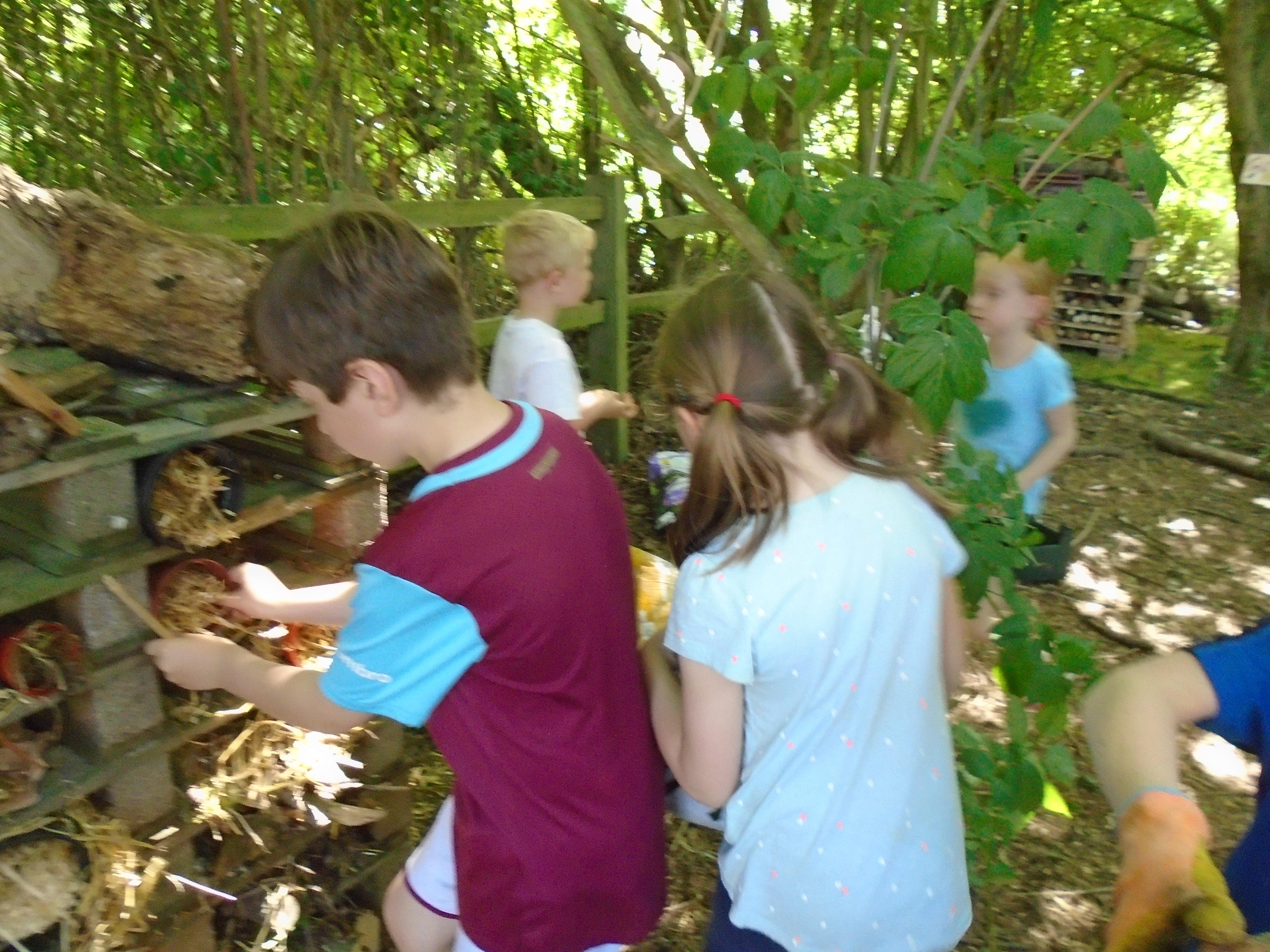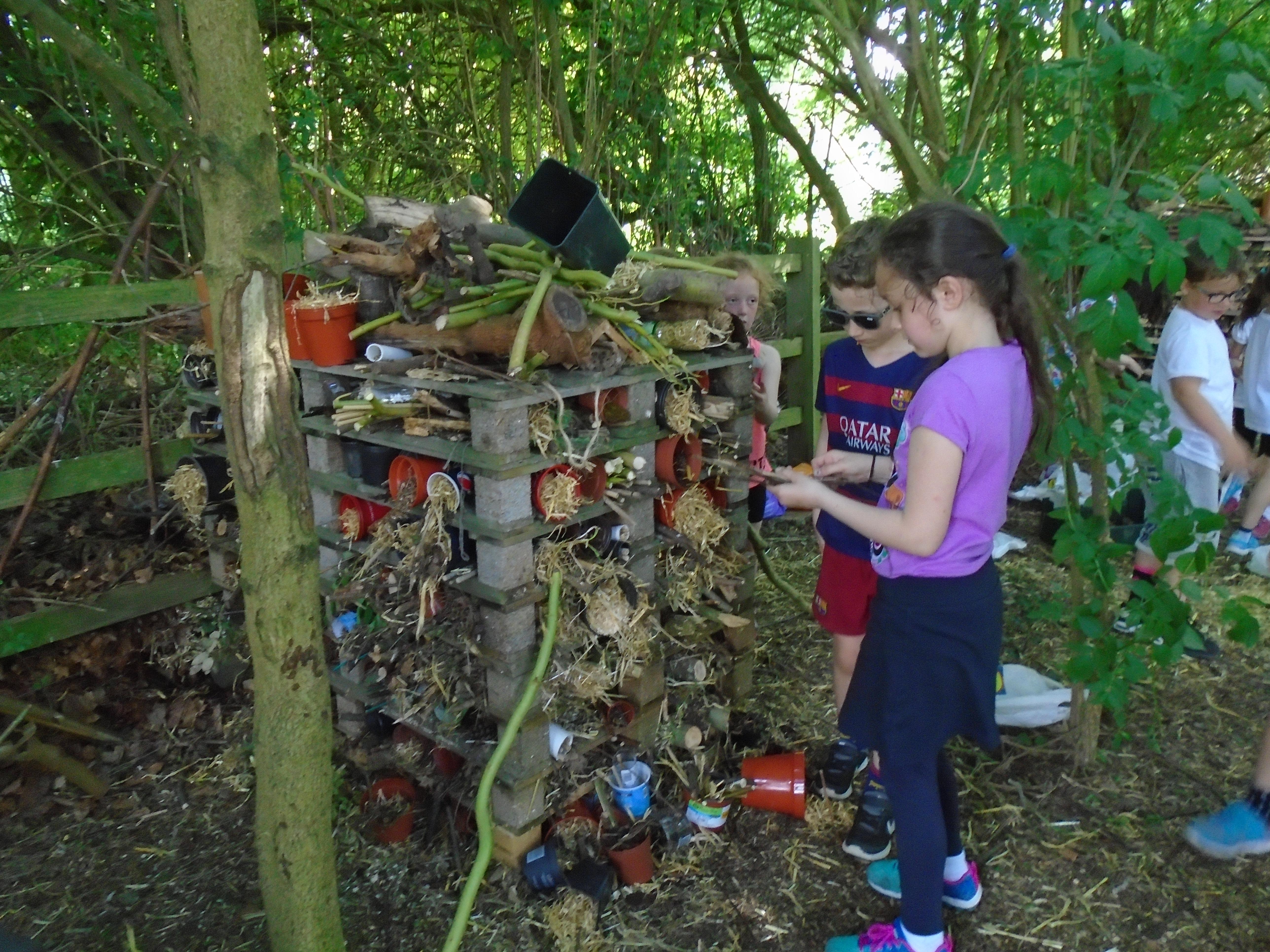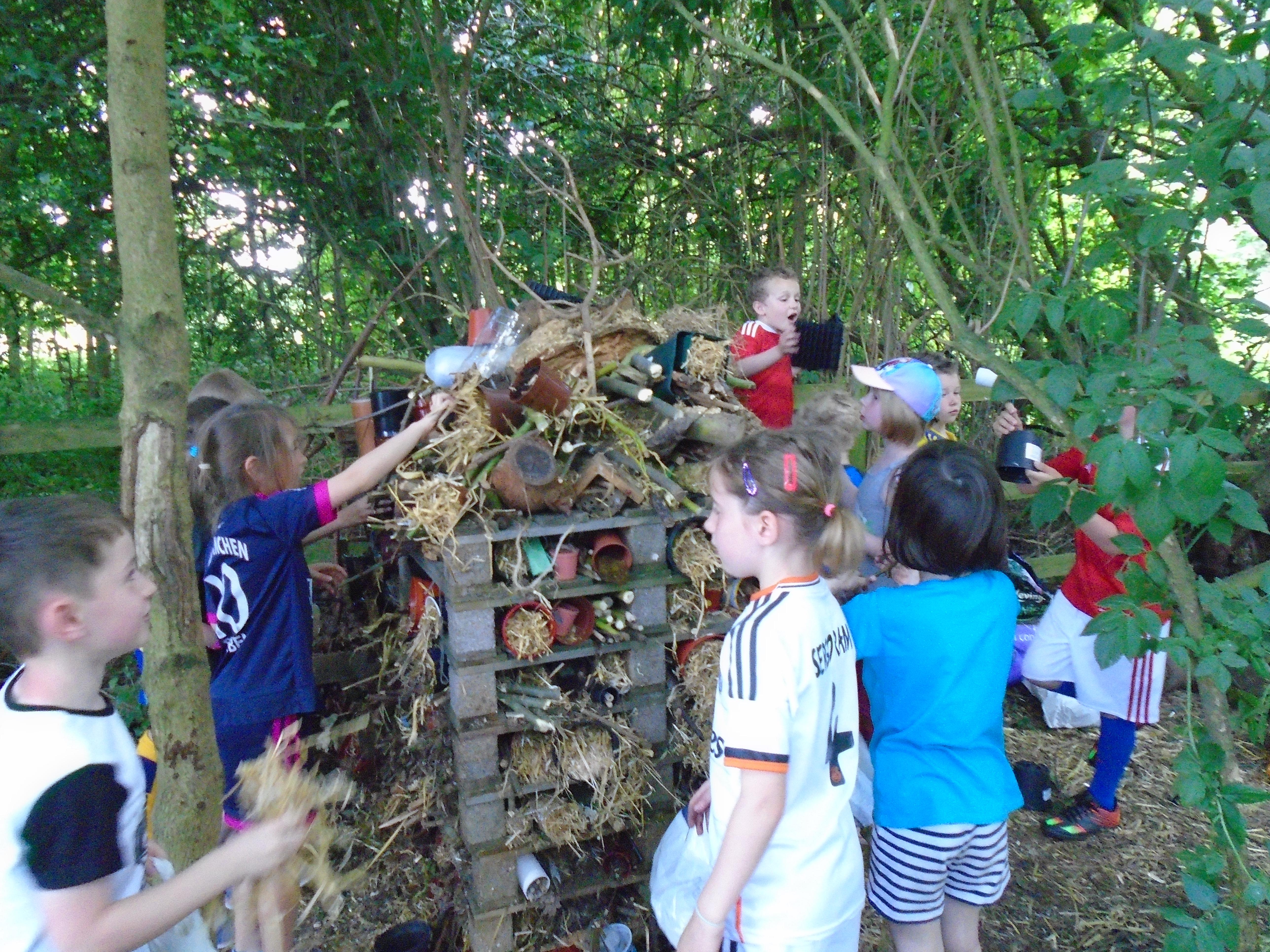 The children from Year 2 had a great time out in the Copse helping Mrs Lunn finish building the second Bug Hotel and making three Bee Hotels which have been placed around the school site. All the children were asked to bring recyclable items in from home and with using branches and wood from the Copse, this is what they made.  Well done to all the Hotel Builders.