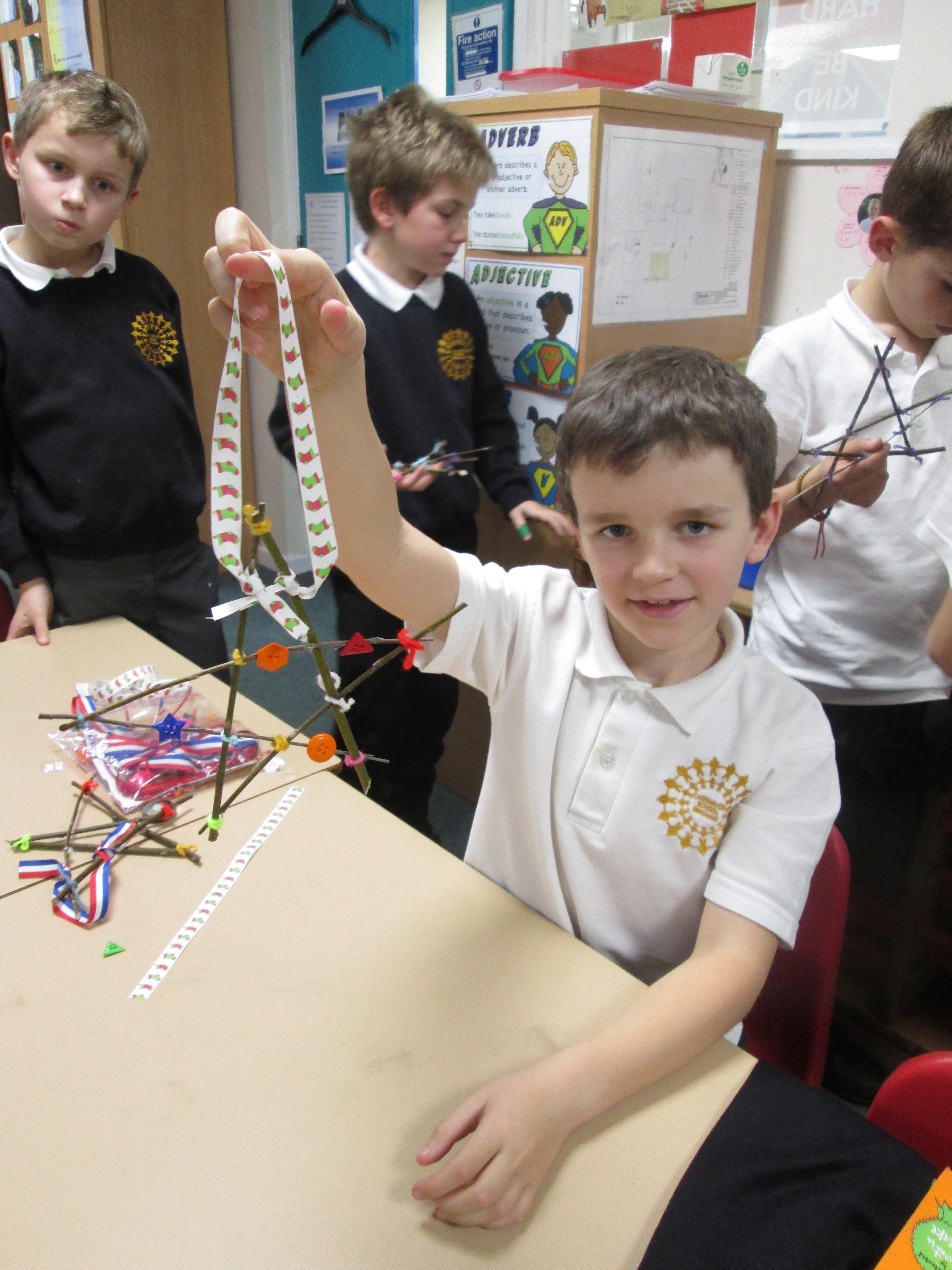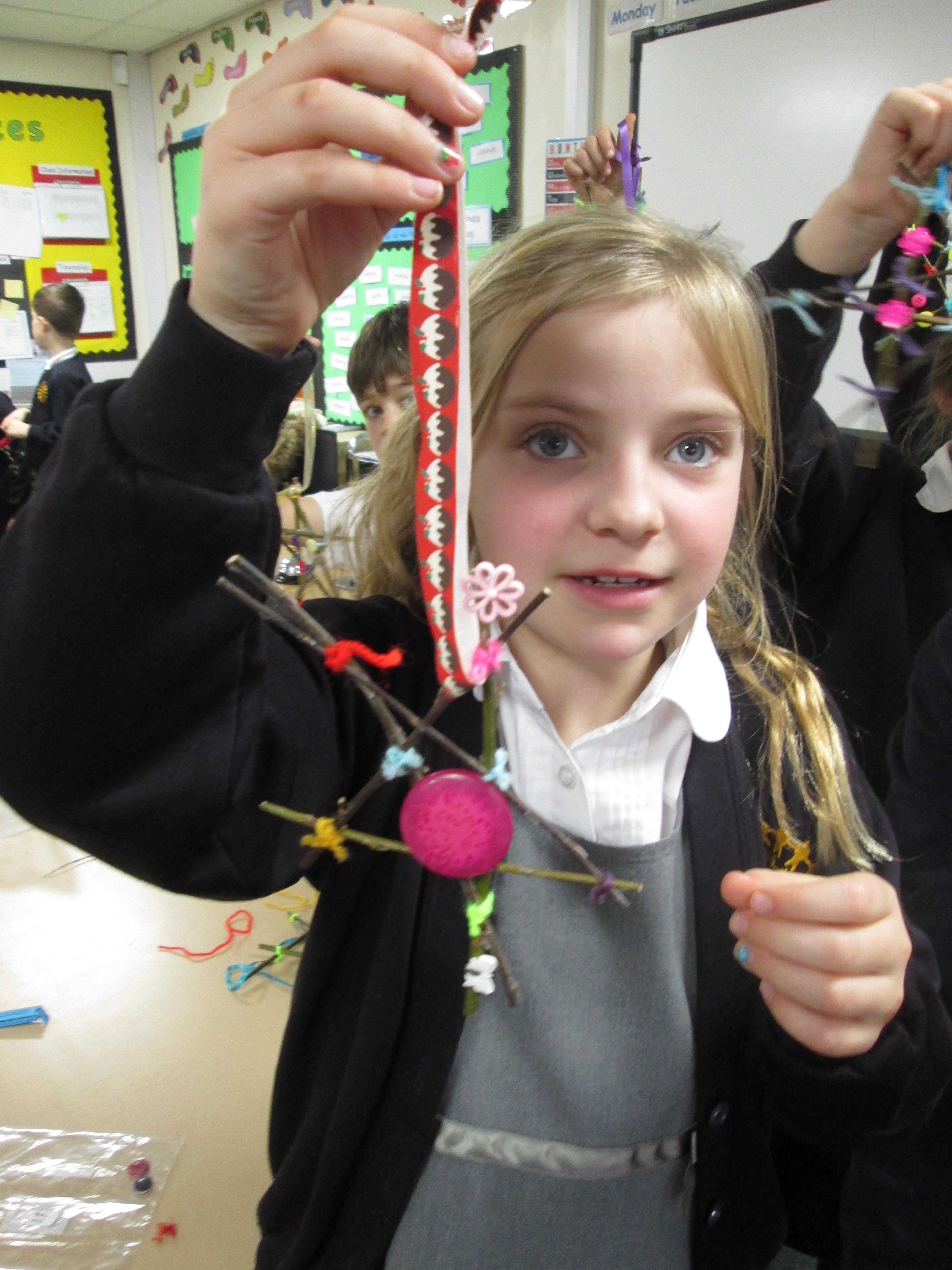As Year 4 held their Eco time at Christmas, what better way to spend their session than making Christmas decorations from recyclable materials.  We asked the children to make Christmas stars using twigs, ribbon and buttons.  Look at what a fantastic job they did.  Well done Year 4.